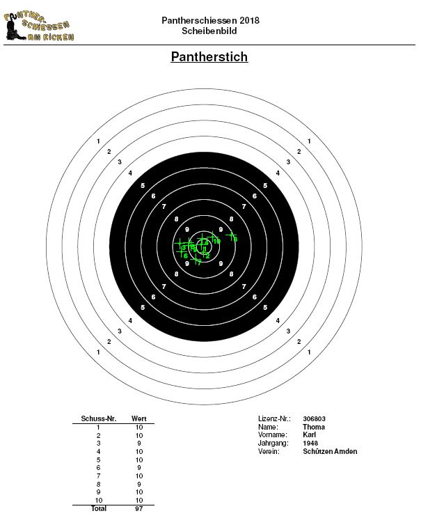 Weiter sind die Ranglisten von Uznach und dem Cholloch online. In Uznach erzielten Ralph Gmür, Mario Büsser und Max Büsser mit 94 Punkten die besten Resultate. Im Cholloch erzielte Karl Thoma das super Resultat von 97 Punkten. Das Scheibenbild darf sich sehen lassen: