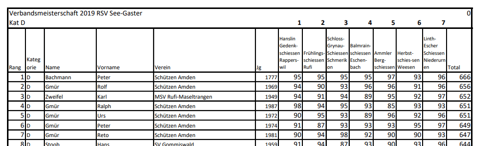 In der Kategorie D feiern die Schützen Amden einen Doppelsieg. Vorjahressieger Rolf Gmür muss dieses Jahr mit dem 2. Rang vorlieb nehmen. Dies darum, weil Peter Bachmann in einer eigenen Liga schoss. Er distanzierte die Konkurrenz um 10 Punkte und mehr. Mit den Schützen der Schützen Amden konnte einzig der Drittplatzierte Karl Zweifel aus Rufi Maseltrangen mithalten. Auf den Plätzen vier bis sieben folgen dann geschlossen Ralph Gmür, Urs Gmür, Peter Gmür und Reto Gmür.