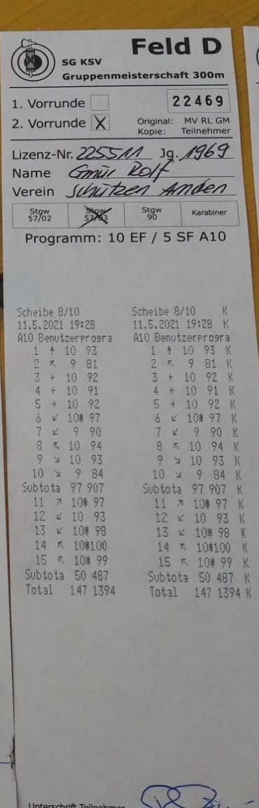 Die Gruppen 1 bis 3 im Feld D haben sehr ausgeglichene Rundenresultate erzielt, so liegen alle zwischen 690 und 695 Punkten. Mit einem Total von 1389 Punkten schliesst die Gruppe 2 die Vorrunden auf dem 3. Rang ab. Das beste Einzelresultat erzielte Rolf Gmür aus der Gruppe 3 mit sensationellen 147 Punkten! Den Einzug in die Hauptrunden leider verpasst hat die Gruppe 4 mit Rang 49.