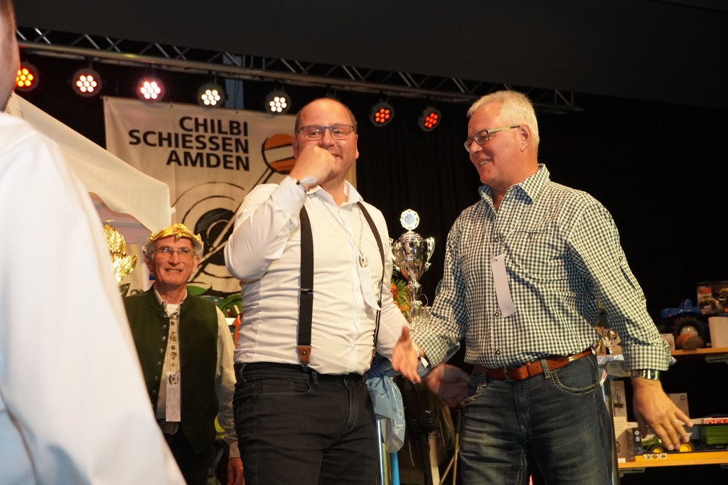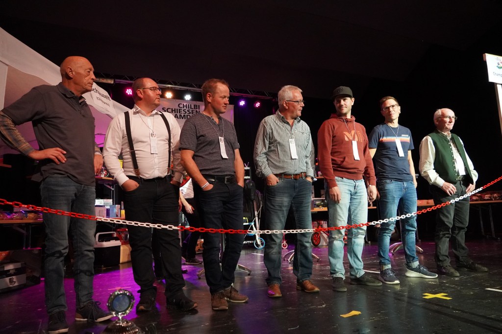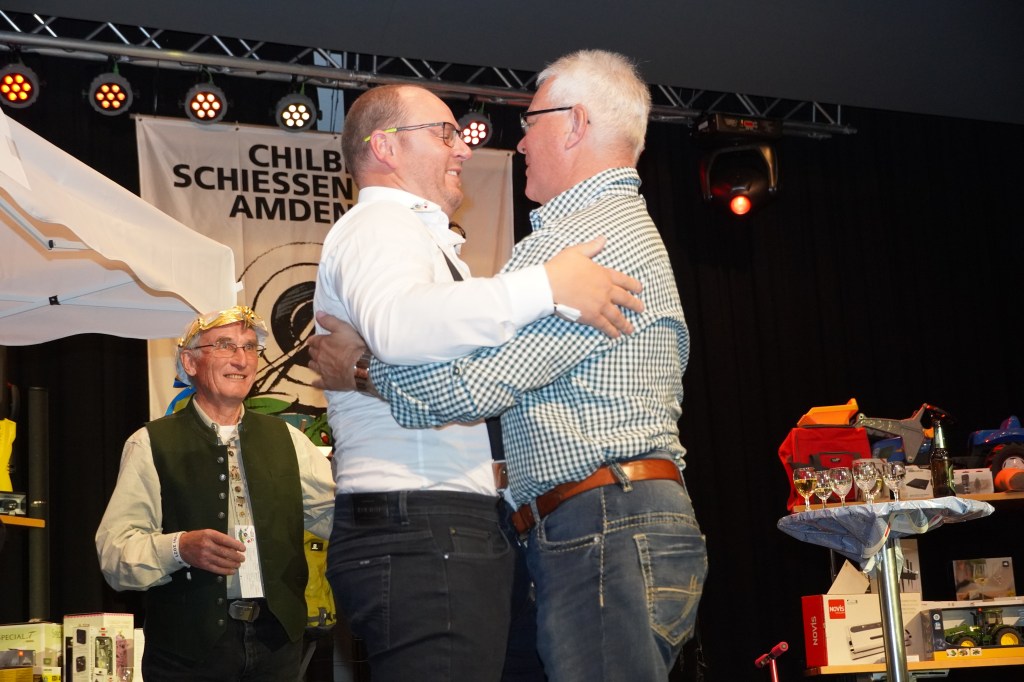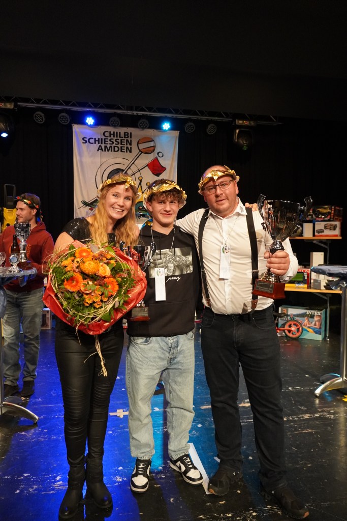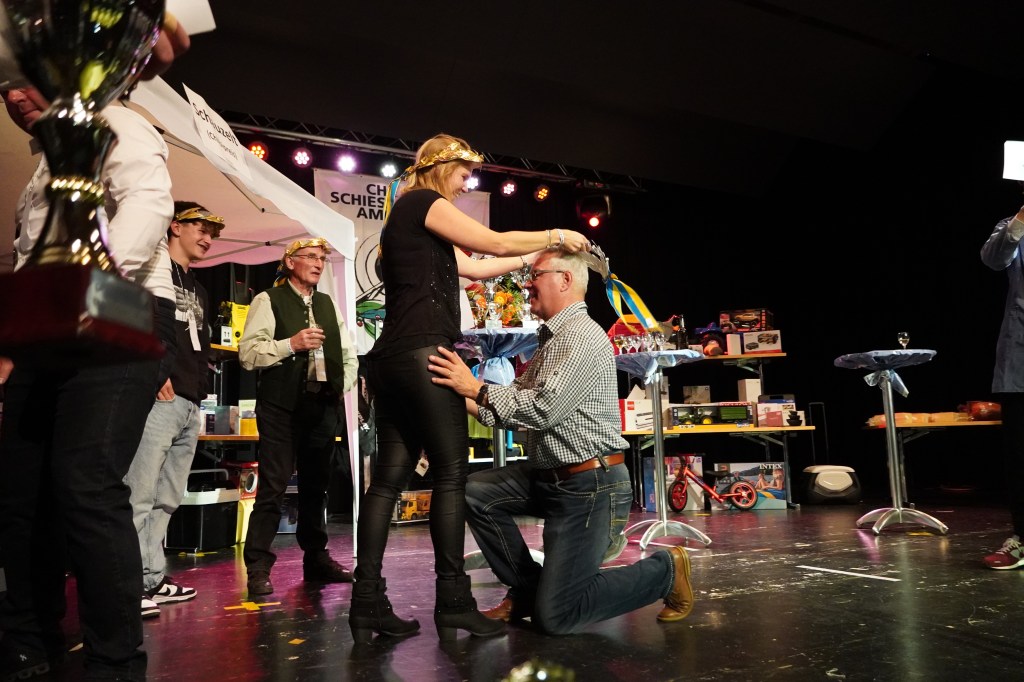 Wie üblich wurden zu Beginn des Abends potenzielle Kopfkranzgewinnerinnen und Kopfkranzgewinner auf die Bühne geholt. Die Überraschung war gross, als nach Beni Gmür, Obern, und Peter Bachmann, Hänsli, auch der Sieger des Gabenstichs, Rolf Gmür, von der Bühne geschickt wurde. Ihm ist im Glücksstich ein «Nuller» unterlaufen, was ihn in der Rangliste zurückspülte. Der erste Kopfkranz des Abends wurde in der Kategorie «Miss Amden» (Frauenkategorie) vergeben. Es gewann Angela Thoma, Schänis, vor Anita Boos, Aeschen, und Veronika Zopfi, Schwanden. Für Angela Thoma war es bereits der 4 Titel. In der Kategorie der «Junioren-Champions» (Jungschützen) kam es am Schluss zum Bruderduell zwischen Jan und Tim Büsser, Rütistrasse. An Tim Büsser gelang die Titelverteidigung – er wurde mit einem super Gesamtresultat von 1’321 Punkten (Overall Rang 4) zum Jungschützenkönig erkoren.