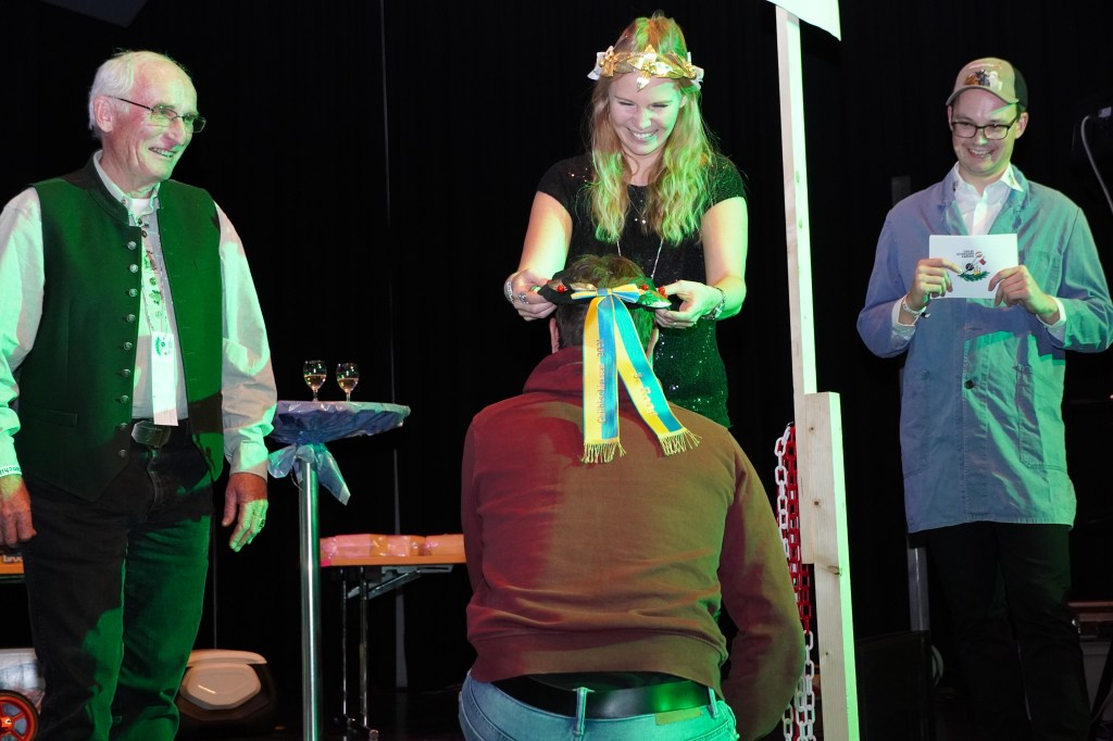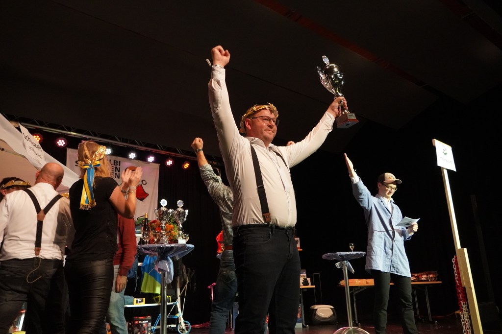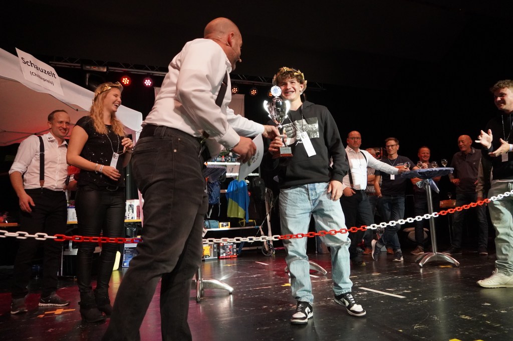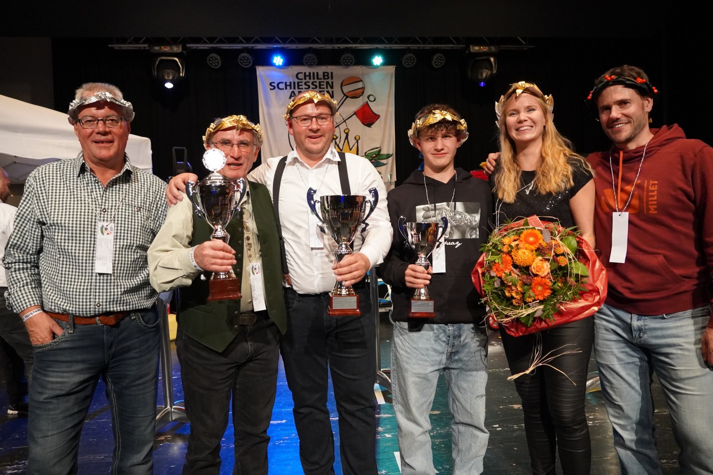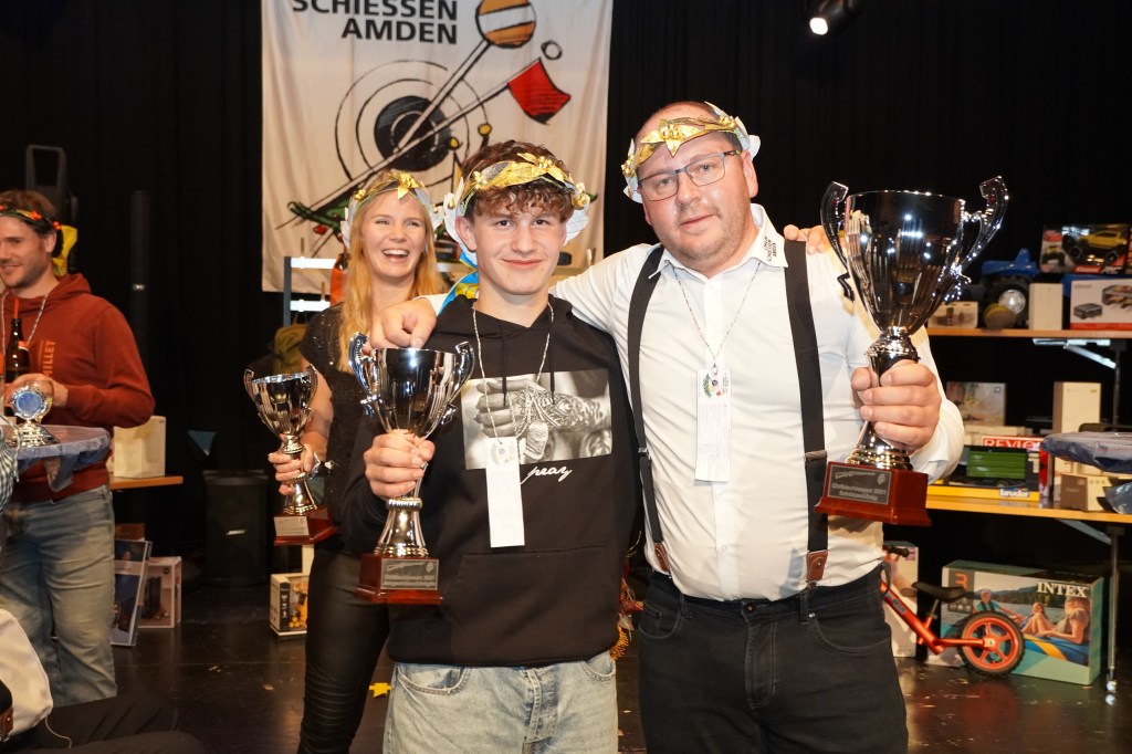 Wie üblich wurden zu Beginn des Abends potenzielle Kopfkranzgewinnerinnen und Kopfkranzgewinner auf die Bühne geholt. Die Überraschung war gross, als nach Beni Gmür, Obern, und Peter Bachmann, Hänsli, auch der Sieger des Gabenstichs, Rolf Gmür, von der Bühne geschickt wurde. Ihm ist im Glücksstich ein «Nuller» unterlaufen, was ihn in der Rangliste zurückspülte. Der erste Kopfkranz des Abends wurde in der Kategorie «Miss Amden» (Frauenkategorie) vergeben. Es gewann Angela Thoma, Schänis, vor Anita Boos, Aeschen, und Veronika Zopfi, Schwanden. Für Angela Thoma war es bereits der 4 Titel. In der Kategorie der «Junioren-Champions» (Jungschützen) kam es am Schluss zum Bruderduell zwischen Jan und Tim Büsser, Rütistrasse. An Tim Büsser gelang die Titelverteidigung – er wurde mit einem super Gesamtresultat von 1’321 Punkten (Overall Rang 4) zum Jungschützenkönig erkoren.