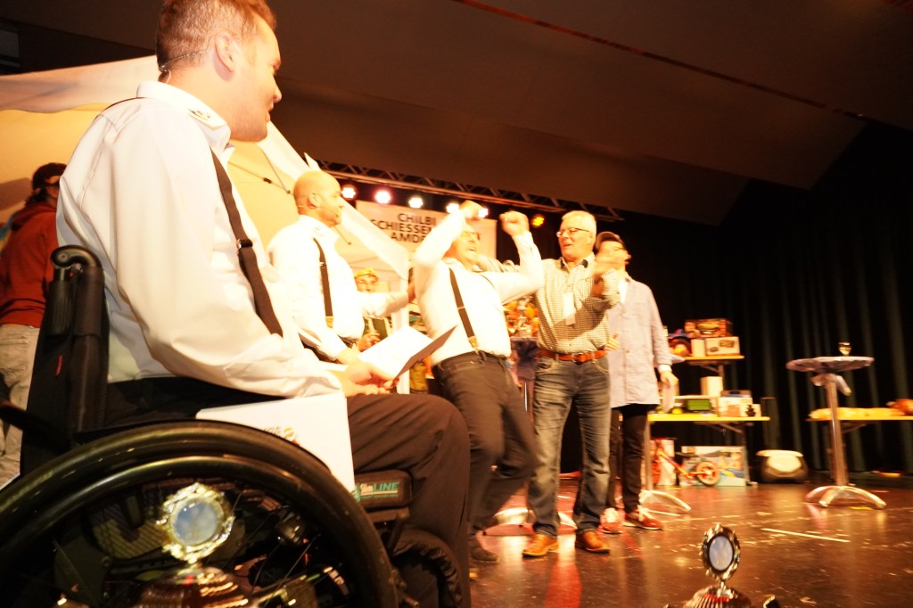 Auch Ivo Gmür und Ralph Gmür, welche im Gabenstich über 900 Punkte geschossen haben, gelang der Glücksstich nicht optimal. Mit 400 resp. 405 Punkten mussten auch sie die Bühne ohne Kranz verlassen. Ivo Gmür belegte (mit 1’310 Punkten) Schlussrang 8, Ralph Gmür (mit 1’314 Punkten) Schlussrang 6. Zwischen Ralph Gmür und Ivo Gmür klassierte sich Mario Büsser (mit 1’313 Punkten), Hofstettenstrasse. Bevor die Resultate der vier verbliebenen Schützen bekannt gegeben wurden, mussten sich diese in den «Schauring» begeben. Während die vier Schützen Runde für Runde im Ring drehten, gab die Chilbikommission einige Bemerkungen zu den vier verbliebenen Schützen ab. Nach dieser Einlage wurde Reto Gmür, Obere Rütibügelstrasse, mit dem Lorbeerkranz (total 1’316 Punkte) gekürt.