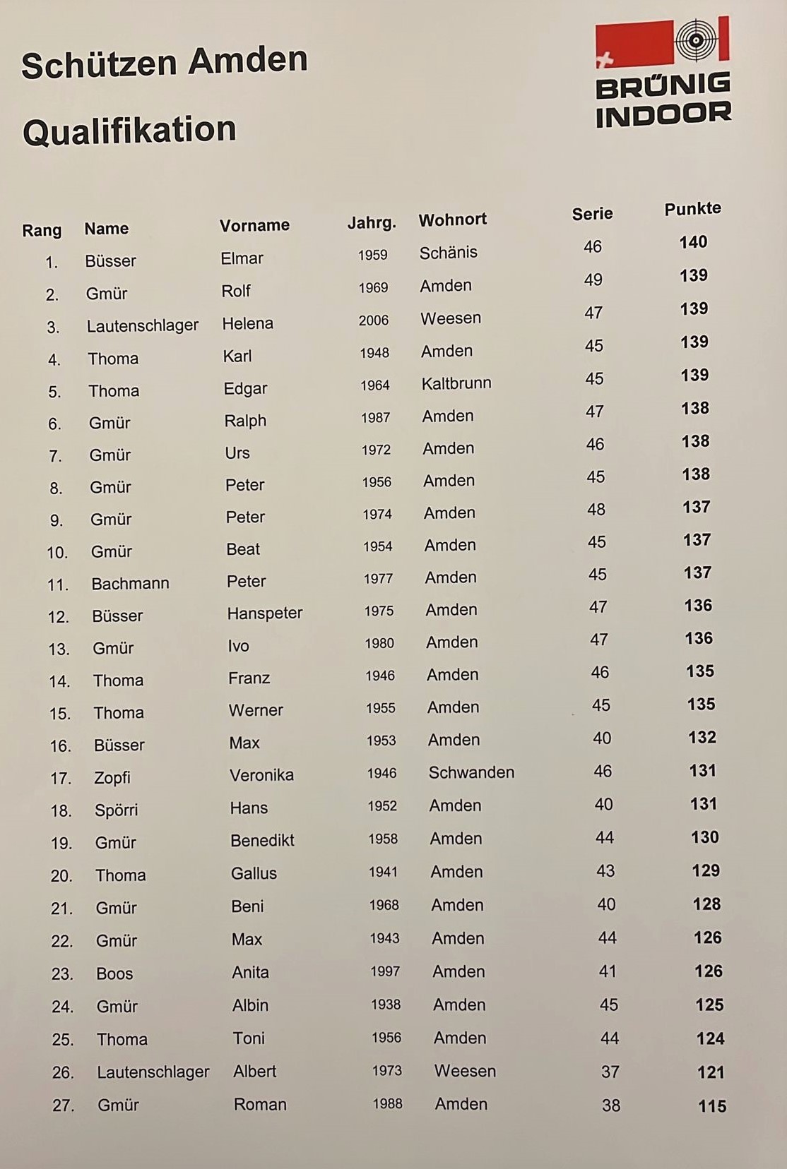 Gestern Samstag fuhren 27 Schützinnen und Schützen zur Schiessanlage Brünig Indoor, um dort den Brünig Champion 2021 der Schützen Amden zu erküren. Bei der Schiessanlage angekommen, gab es erst einmal eine Stärkung mit Kafi und Gipfeli und eine kurze Führung durch die Schiessanlage. Anschliessend ging es los mit dem Vormittags-Schiessprogramm. Jede/r Schützin/Schütze absolvierte das Gruppenprogramm (10 Schuss Einzel und 5 Serie auf die Scheibe A10). Die besten 14 Schützen qualifizierten sich dann für den grossen Final, bei dem um den Brünig Champion geschossen wurde. Die restlichen Schützen machten den Brünig Sieger unter sich aus. Für die meisten war es das erste Mal, dass sie in einer Indoor-Anlage geschossen haben und so hatte doch der eine oder andere ein wenig zu kämpfen mit den ungewohnten Bedingungen. Das höchste Resultat der Quali erzielte Elmar Büsser mit 140 Punkten. Knapp dahinter, auf den Rängen 2 bis 5, klassierten sich 4 Schützinnen und Schützen mit 139 Punkten, darunter auch die einzige Jungschützin, Helena Lautenschlager, bravo!