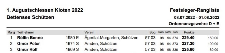 Ebenfalls nahmen die Schützen Amden mit 15 Schützen am 1. Augustschiessen in Kloten teil und belegten in der Sektionsrangliste mit 92.568 den 2. Rang. Auch mit der Gruppe waren wir erfolgreich: Die Gruppe „Schibächnölli“ klassierte sich mit 465 Punkten auf dem 3. Rang, der Gruppe „Walensee“ lief es nicht ganz nach Wunsch, es resultierte Rang 9 mit 451 Punkten. Zu guter letzt sind wir auch in der Festsiegerkonkurrenz an der Ranglistenspitze vertreten. Die Gebrüder Pidu und Rolf belegten die Ränge 2 und 3, bravo! Alle Resultate findet Ihr unter dem folgenden Link.