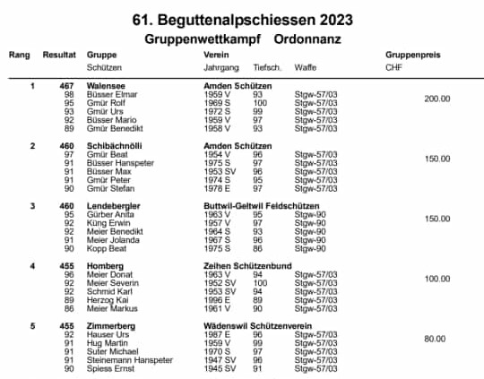 Am 61. Beguttenalpschiessen gab es für die Schützen Amden einen Doppelsieg im Gruppenwettkampf Ordonnanz zu bejubeln, herzliche Gratulation den Schützen der beiden Gruppen Walensee und Schibächnölli. Der amtierende Schützenkönig Büsser Elmar mit 98 Punkten und dä Chäsärä Beat mit 97 Punkten waren dabei die herausragenden Akteure.