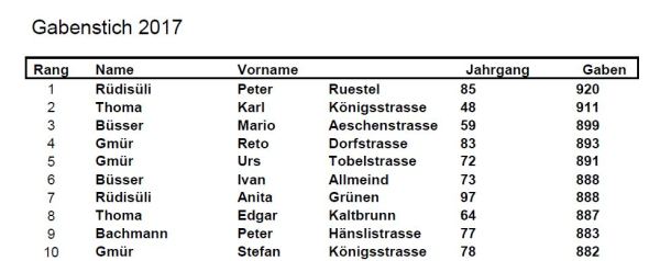 Liebe Schützinnen, liebe Schützen An den vergangen zwei Wochenenden fand das Chilbischiessen 2017 statt. Total haben 148 Schützinnen und Schützen teilgenommen. Die Zwischenrangliste (Gabenstich) führt Peter Rüdisüli, Ruestel, mit sehr guten 920 Punkten an. An zweiter Stelle folgt der bisher beste Veteran, Thoma Karl, Rüti, mit 911 Punkten. Mario Büsser, Aeschen, erzielte 899 Punkte und... Continue Reading →