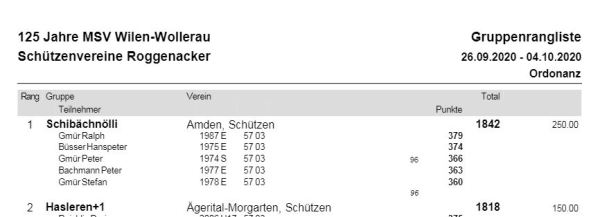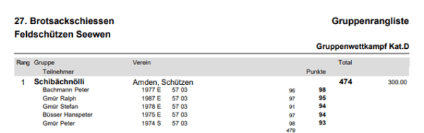 Die Ammler Gruppenschützen sind weiterhin kaum zu bezwingen. Die Gruppe Schibächnölli, bestehend aus Ralph Gmür, Hampi Büsser, Peter Gmür, Stefan Gmür und Peter Bachmann gewinnen den Gruppenstich am Jubiläumsschiessen des MSV Wilen. Mit 24 Punkten Vorsprung auf die weiteren Gruppen setzten sie sich souverän durch. Die höchsten Resultate erzielten Ralph Gmür (379 Punkte) und Hanspeter... Continue Reading →