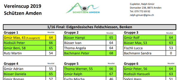 Anlässlich des Feldschiessenabsenden im Restaurant Rössli wurde die Auslosung für die 2. Cup-Runde vorgenommen. Die 44 verbliebenen Schützinnen und Schützen wurden in elf Vierergruppen eingeteilt. Die Gruppenzusammensetzungen können diesem Link entnommen werden. Für die 2. Cup-Runde ist das Freundschaftsschiessen mit dem MSV Speer-Laad, welches am Samstagnachmittag, 22. Juni 2019 stattfindet, massgebend. Falls jemand am Freundschaftsschiessen... Continue Reading →